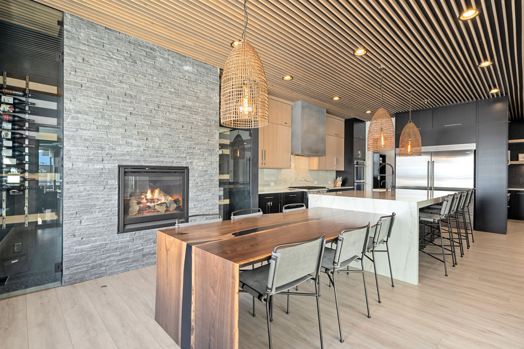 Highlights of the home include the moody kitchen with wood slat ceiling, Venetian plaster fireplace, tons of glass everywhere, including the stair railing, and new statement lighting.