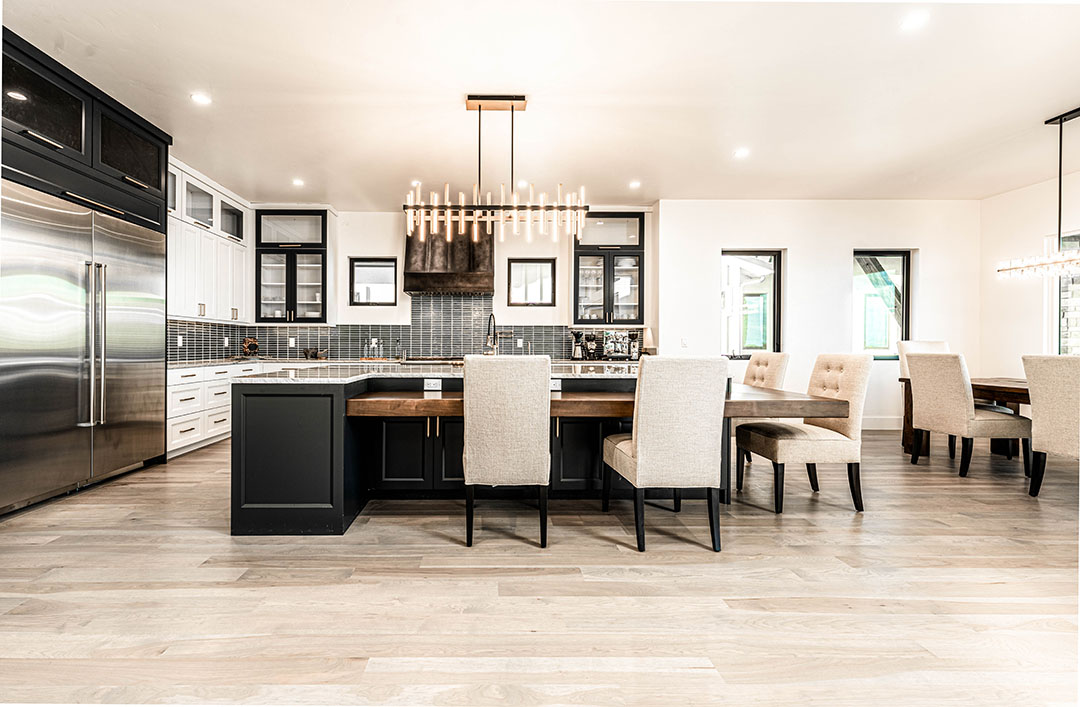 The handmade Rustica front door pivots open to a massive great room with a six-foot-long commercial fireplace incorporating floor-to-ceiling stonework and a cantilevered concrete hearth. It’s an open space that integrates the kitchen and bar, and on the opposite end, there are LaCantina folding doors that reveal a wide deck overlooking McNeil Reservoir.