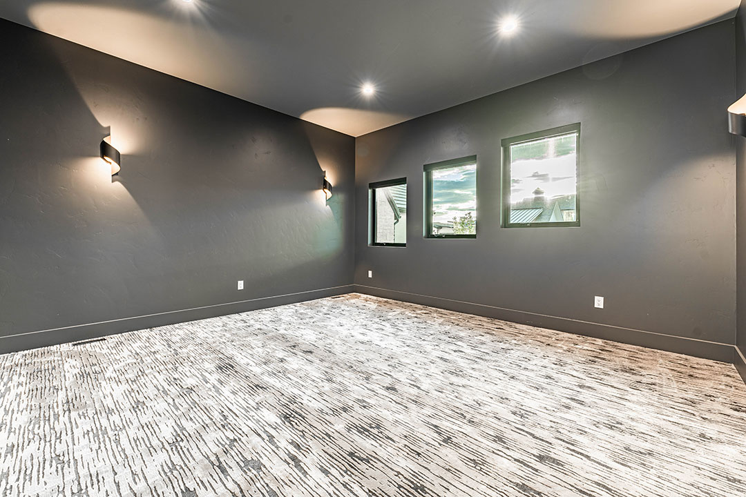 At the base of the wine cellar is an epoxy floor that leads to a 40-foot lap pool behind glass walls. The pool deck has its own bathroom and cubbies for guests to store their personal items. The best part? Swimmers get up-close views of the reservoir through the walk-out basement’s three sliding glass doors.