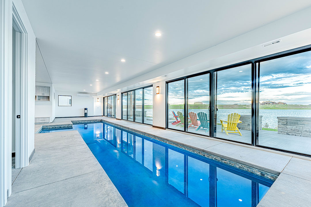 “I wanted to have swimming lanes because I wanted to do laps year-round,” the homeowner says. “That worked out well with the back space of the house. You have access to the fresh air and the sun if you want to sit out on the patio.”