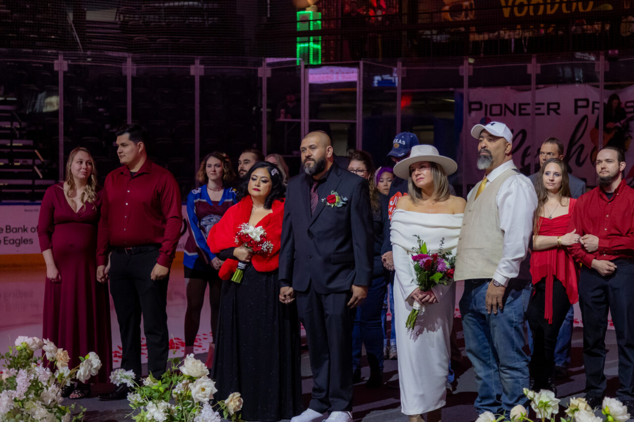 Over the last eight years, more than 300 couples have either tied the knot or renewed their vows at the Loveland Valentine’s Day Group Wedding. This year, with the support of Big Deal Company and Visit Loveland, 20 couples from three different states celebrated their love on the ice at Blue Arena. Branden Sipes played romantic music as they strolled down a red carpet, and Todd Harding presided over the collective marriage ceremony. Each couple received a padlock to symbolically “lock their love” onto the well-known heart sculptures in Loveland, and they enjoyed festivities with friends and family until the Colorado Eagles hockey game later that evening.