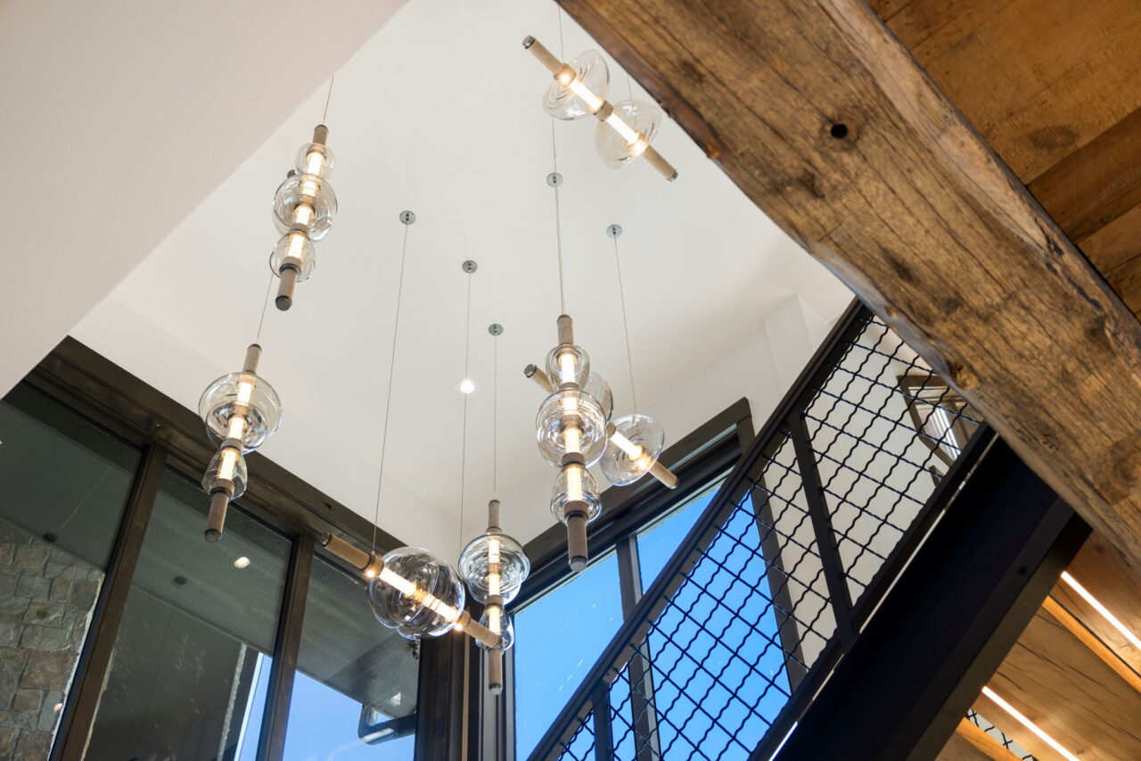 Reclaimed wood is repeated throughout the home, including the steps that ascend to the lofty second floor. A light fixture that doubles as an art installation is suspended above the steps, with tubular, hand-blown glass bulbs that emit light all the way through. Black glass and suede fabric surround the bulbs, creating just the kind of balance Schuman was after.