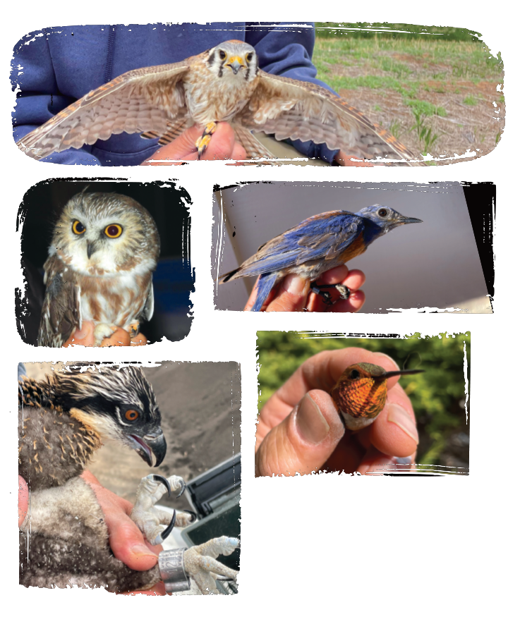 Some of the many birds Rashid has banded: American kestrel (top), northern saw-whet owl (middle left), western bluebird (middle right), osprey (bottom left) and rufous hummingbird (bottom right).