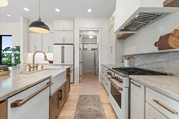 “For me, it was about texture in this house,” says Lindsay Law, a designer for Custom On-Site, who is also Skott’s niece and an integral part of the family business. She points to the grain of both the wood and stone as well as the quartzite island in the kitchen. Stretching more than seven feet long and five feet wide, the island has “a lot of movement,” she says, noting the textured waves that are somehow warm and cool at the same time.
