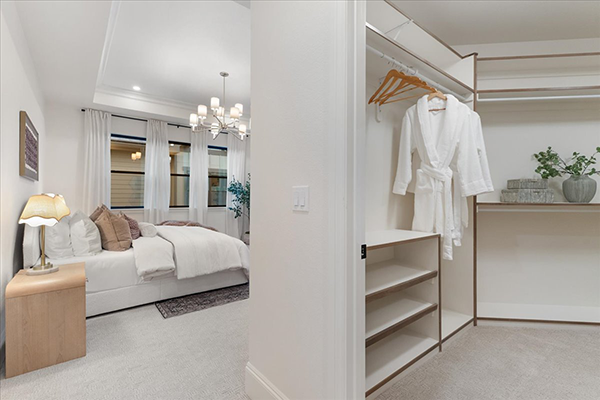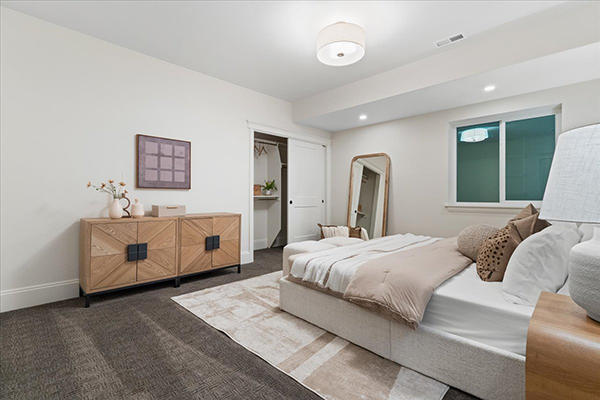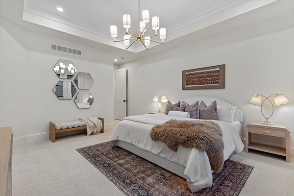 The main floor of the home features two bedrooms and two-and-a-half baths, including a spacious primary suite. Crown molding in the primary bedroom offers a nod to the traditional craftsman style, Law says, while the coffered ceiling adds even more dimension to the cozy retreat. Attached is a large walk-in closet with custom trim work, another creative yet subtle way Skott and Law warmed up the home with natural wood.