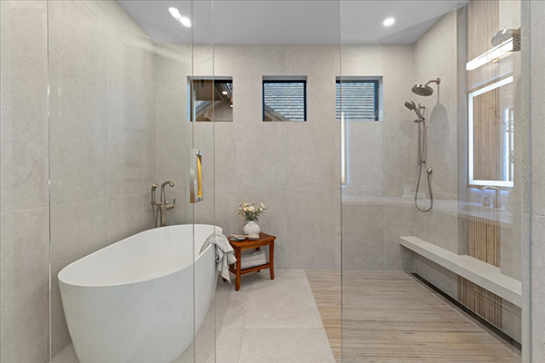 Alder cabinets, warm tile walls and soft lighting set the mood in the primary bath. However, the focal point is the large glass enclosure housing a white freestanding tub, shower and stone bench.