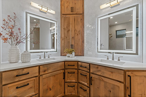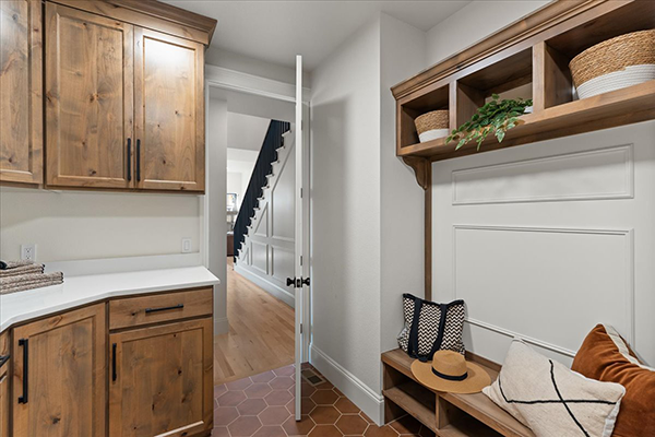 That’s true for other areas that will get their fair share of use. The laundry room boasts a large quartz countertop and a matching platform above the washer and dryer for folding clothes, plus a durable tile floor and knotty alder cabinets with lots of storage. A detailed trim wall accents both the hallway and the laundry room, adding yet another texture to the space while giving it an elevated feel.