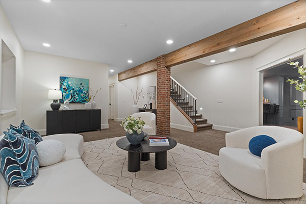 While Law loves the loft, her favorite part of the home is hidden in the basement. Just past a brick pillar she added to “throw it back to some vintage vibes,” there’s a speakeasy complete with dark paneled walls, a brick fireplace and a bar.