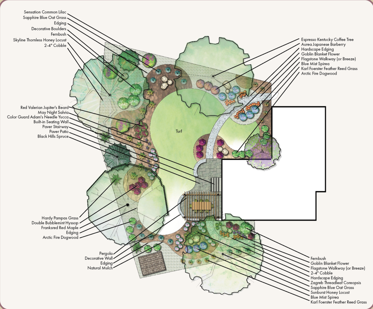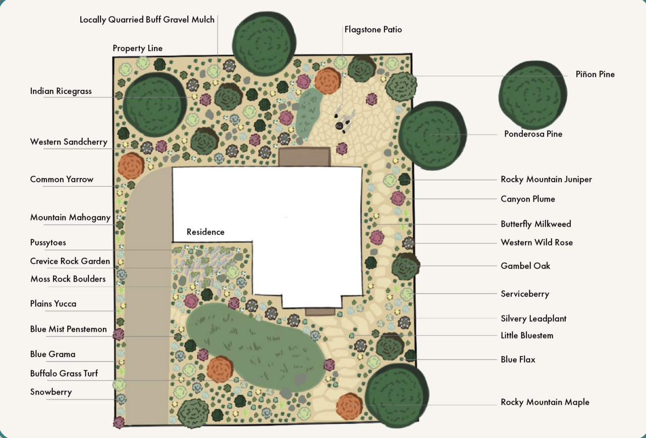 Blue Spruce Horticulture foothills landscape design.  Drawn by Arden Cherry.